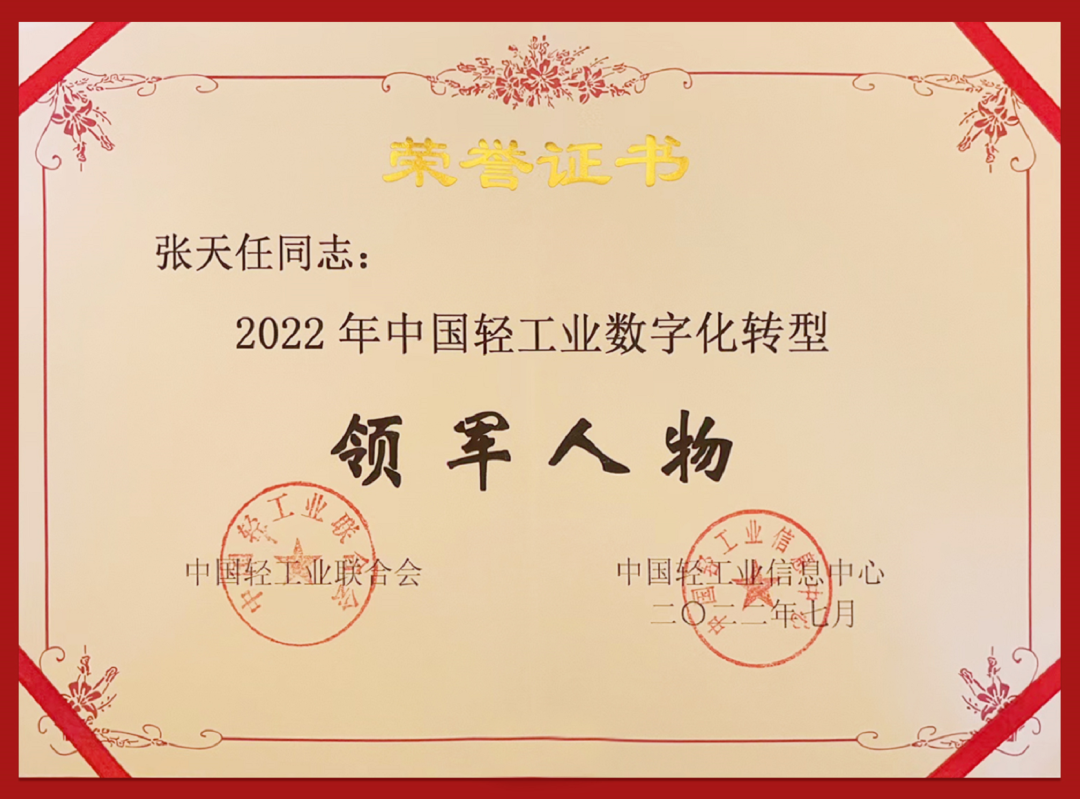 ● 7月27日,在第十二届中国轻工业信息化大会上,JJB电竞控股集团获得“中国轻工业数字化转型先进单位”,张天任董事长获得“中国轻工业数字化转型领军人物”。